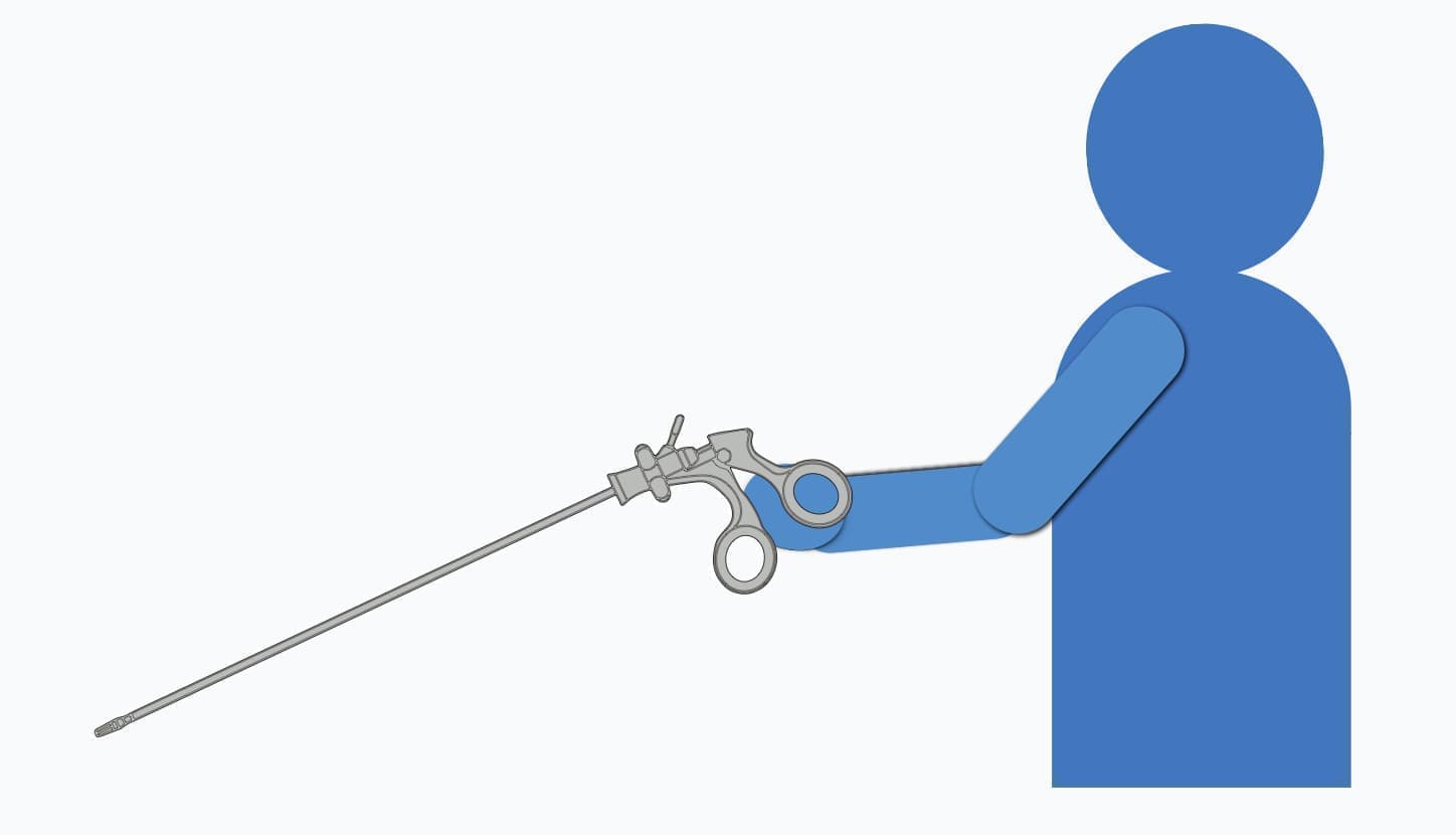 実際の手術は右にあるような鉗子(かんし)と呼ばれる器具を使って行います。イメージとすればマジックハンドのような器具で手元で操作をするとお腹の中にある先端が動く仕組みになっています。鉗子にはいろいろな種類があり、物を掴んだり、切ったり、つまんだりと様々なタイプの道具を使って手術を行います。