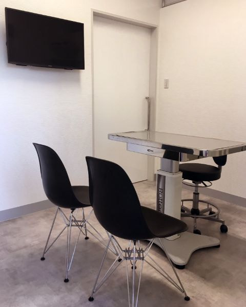 病院というものはどうしても暗くなりがちで閉鎖的に感じてしまいます。また、診察の内容が深刻だった場合には、暗くて閉鎖的な診察室の中だとさらに悲観的に感じられてしまうこともあります。診察中にもガラスからは光が照らし、外が覗ける開放的な雰囲気で飼い主さんとしっかりとお話をしたいと思ってこのような構造にしました。もちろん構造だけではなく、内容もガラス張りのような内容にしたいと考えています。