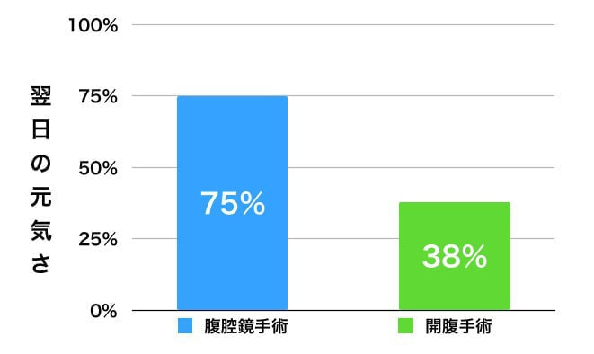 手術を行うと痛みや不快感から動物はどうしても元気をなくしてしまいます。不妊化手術において、術前と術後での活動性(元気さ)がどのように変化するか調べた報告があります。手術を受ける犬の術前の動きをセンサーを使って調べ、その犬が手術後48時間にどのように変わるのかを記録しました。結果、開腹手術では手術前に比べて活動性は平均38%、つまり術前に比べて3分の1の動きしかなくなってしまいました。元気は68%減少したのです。一方、腹腔鏡手術では術後の活動性は75%、手術前の3分の2となりました。これは術前より25%の減少に留まったのです。これからも腹腔鏡手術では動物に与える負担を減らせる可能性が考えられたのです。