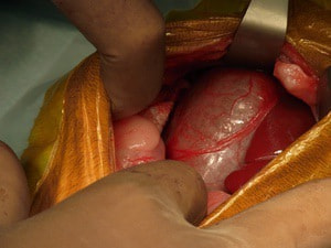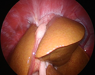 お腹の中にカメラと数本の鉗子と呼ばれる手術器具をいれます。写真の中央にあるのが胆嚢です。胆嚢の周囲には赤い色の臓器が存在していますが、これが肝臓です。胆嚢は右葉と方形葉と呼ばれる肝臓の部位に挟まれて存在しているために写真では中央に胆嚢がみえます。胆嚢の下にある臓器は胃です。胃は比較的大きな臓器でお腹の中で動くために手術の時に邪魔になってしまうこともあります。右と左から出て来いている黒い”棒”が鉗子です。この写真で使っているのは直径が5ミリメートルの器具になります。右手と左手で操作しながら手術をすすめていきます。