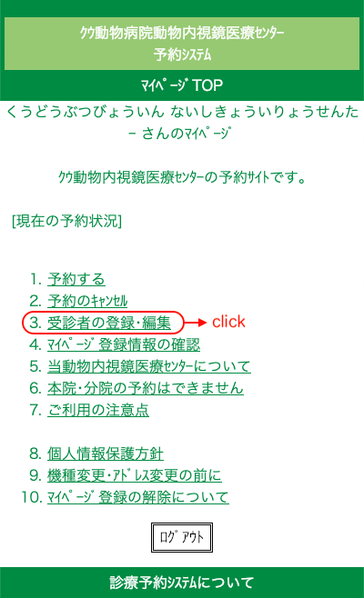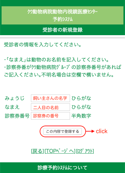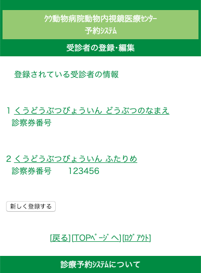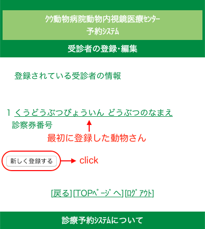 追加登録 予約専用ページへログイン 予約サイトへアクセスし、登録したメールアドレス、パスワードを記入してログインしてください。 専用サイト clickで拡大 受診者の登録を行う ログインして表示されたメニューの”3.受診者の登録・編集”を選択します。 clickで拡大 新しい患者さんを登録する 以前に登録した動物名が表示されます。その下に表示される新規登録ボタンを選択し、登録に進みます。 clickで拡大 新規登録 表示された空欄に、飼い主さんの名字、二人目の名前、診察券番号を記入します。 clickで拡大 登録内容の確認 記入された内容に間違えのないことをご確認ください。 clickで拡大 ページのトップへ HOME | 診療予約 | 患者さんの追加登録